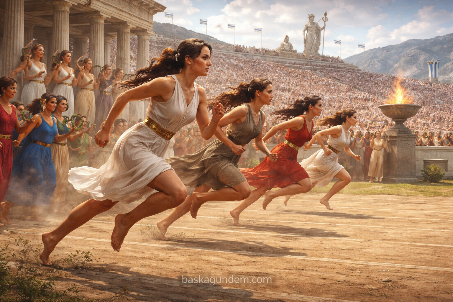 Antik Yunan’da kadınların spor faaliyetlerine katılımı uzun süre tartışmalı bir konu olmuştur. Antik olimpiyat oyunları genellikle kadınlara kapalıydı, ancak kadınlar farklı spor etkinliklerinde yer alabiliyordu. Özellikle Hera’ya adanmış olan ve dört yılda bir düzenlenen Heraia adlı koşu yarışlarına katılabiliyorlardı. Bu yarışmalarda evlenmemiş genç kızlar, farklı yaş kategorilerinde mücadele ederek çeşitli yarışmalarda yer alıyorlardı.